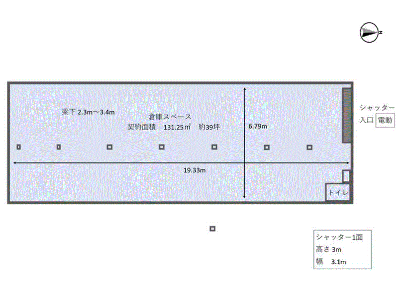 | 設備関連 | 空調無し 電動シャッター 洋式トイレ、手洗い場あり(上下水道料金:月額5,000円) 天井高梁下2.3m~3.4m | |