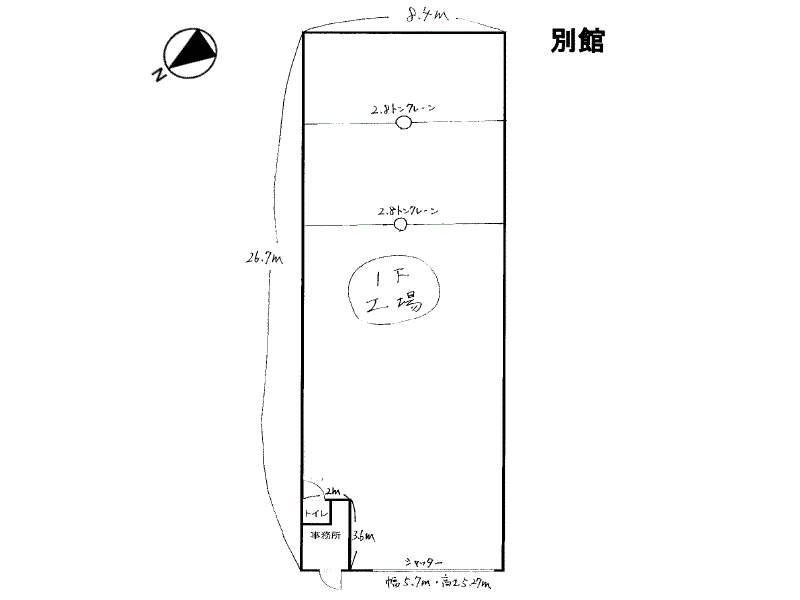 | 設備関連 | トイレ専用 事務所有 *2.8トンクレーン2基有り※存置物のため、維持管理は借主負担となります。 | |