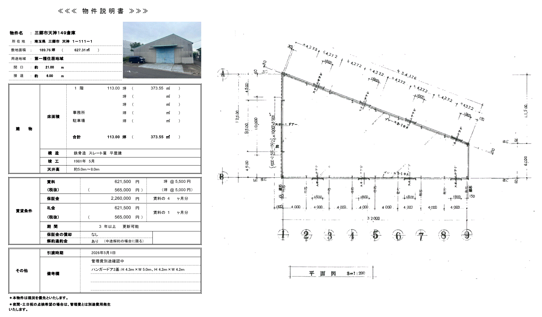 | その他 | *天井高約5.0m~8.0m *中途解約時、解約違約金あり *火災保険加入要 |