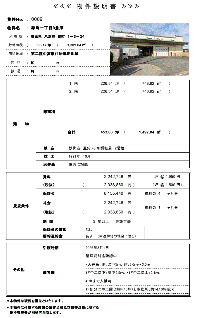 | 設備関連 | 電気引き込み有 上水道 本下水 トイレ 事務所有 貨物用リフト |