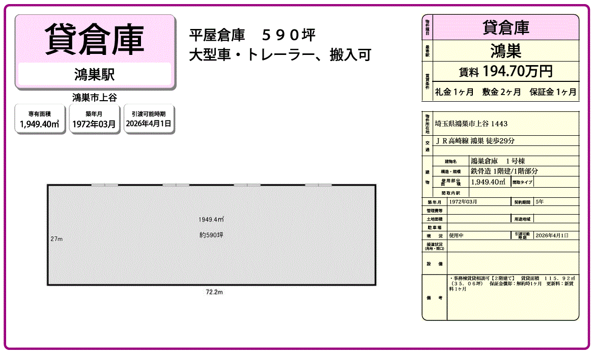 | 倉庫 | 平家建貸倉庫 2階建事務所棟賃貸相談可 大型トレーラー可 駐車スペース付 |