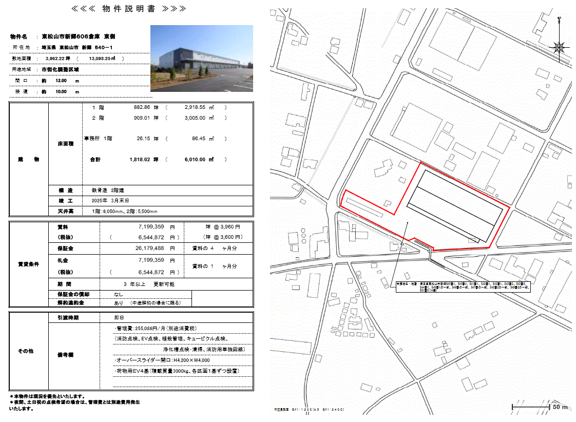 | 設備関連 | 電気引き込み有 荷物用3tEV2基(各区画1基) キュービクル 浄化槽 事務所有 |