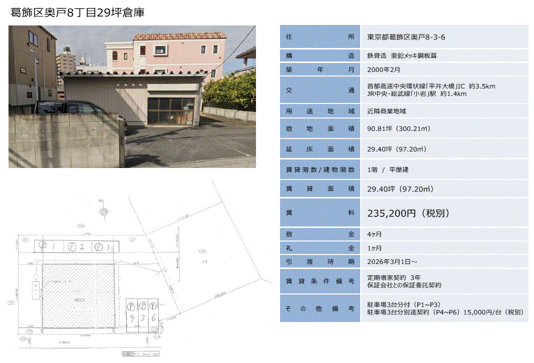 | 倉庫 | 平家建 駐車スペース3台分付 幹線道路沿 |