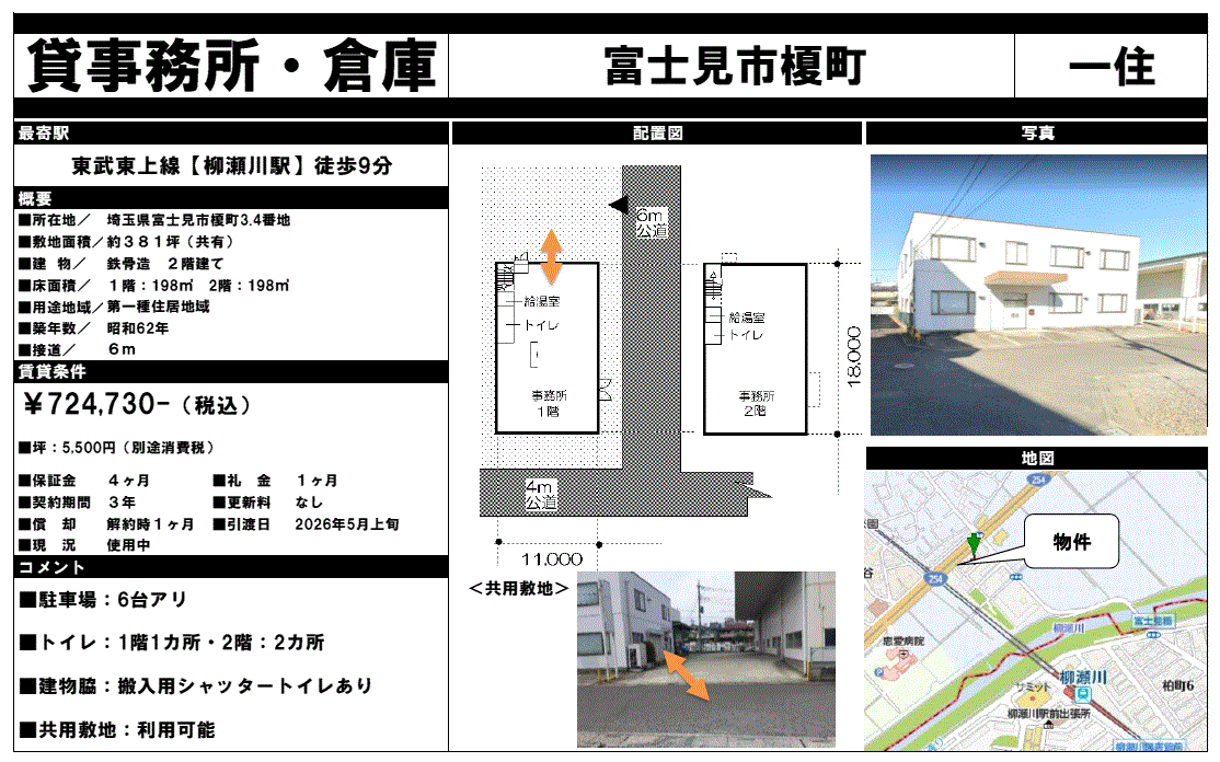 | 倉庫 | 2階建貸事務所、倉庫 駅近徒歩9分 駐車スペース6台分付 |