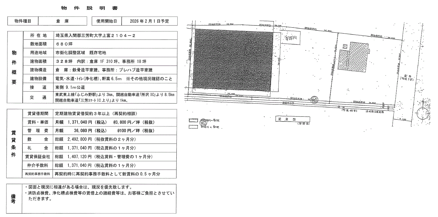 | 倉庫 | 平家建 大型車通行可 所沢ICより約8.5km 前面ヤード広々! 事務所有り 駐車スペース付 |