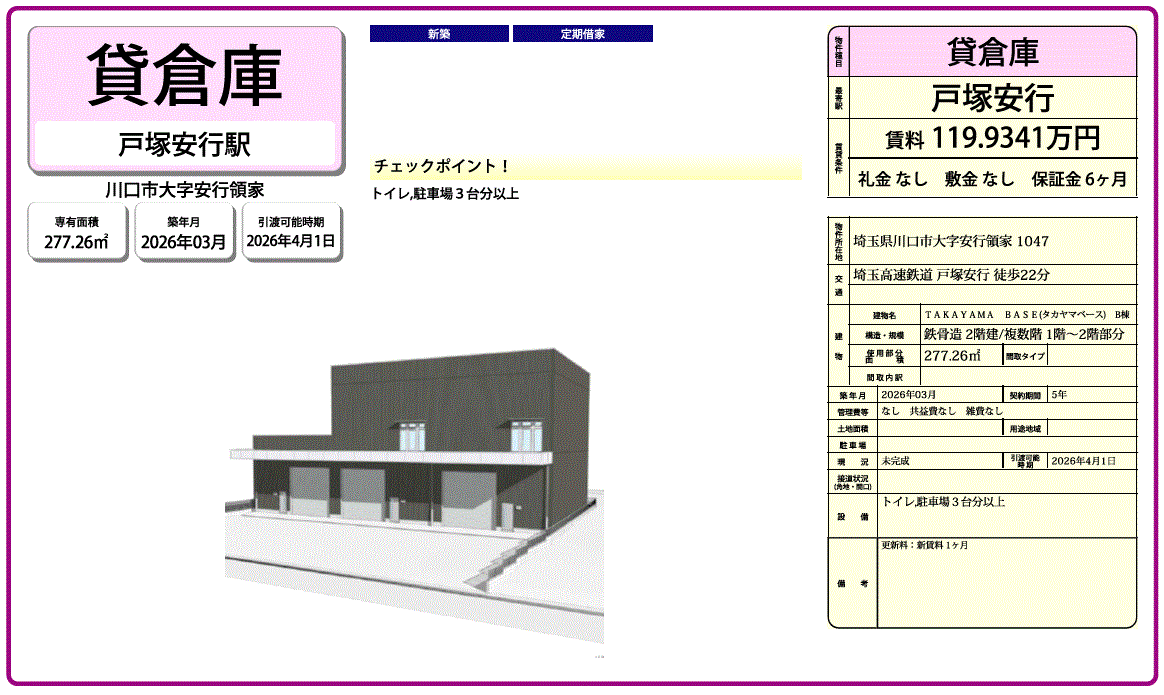 | 倉庫 | 未完成 新築 2階建1階部分貸倉庫 駐車スペース付 準工業地域 |