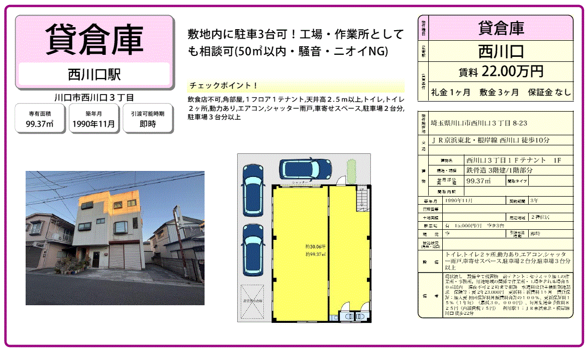 | その他 | *現況渡し *駐車スペース:月額15,000円/台、3台分空有 *作業所工場の場合、50m2以内,22時まで *保険加入要 *保証会社加入要 |