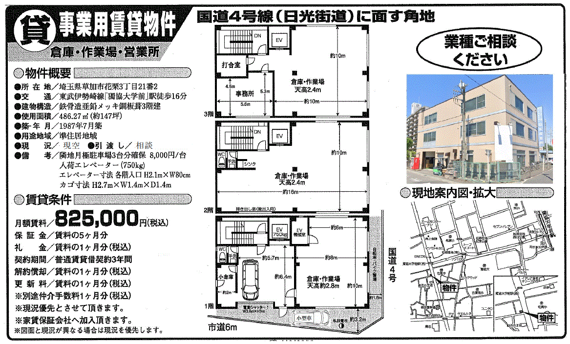 | 倉庫 | 750kgEV有 幹線道路沿 駐車スペース付 |