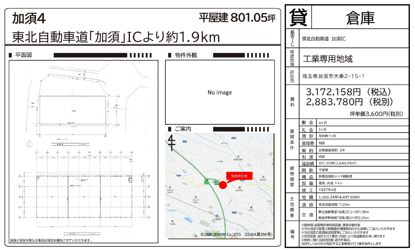 | 倉庫 | 平家建貸倉庫 工業専用地域 駐車スペース付 加須IC至近 |