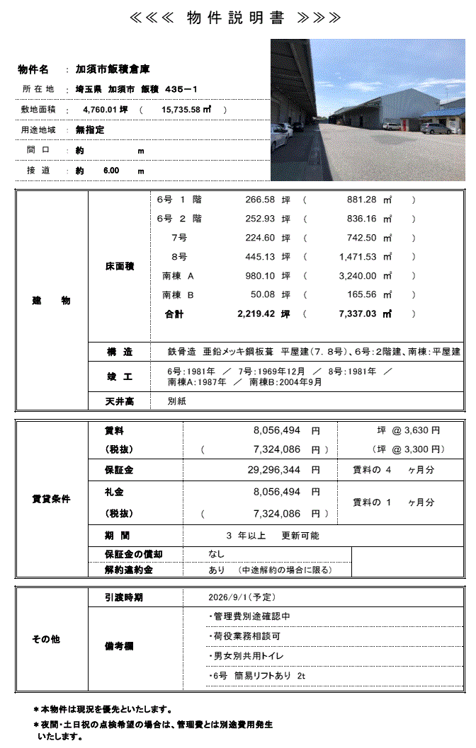 | 倉庫 | 平家建 5棟一括貸し キュービクル有 駐車スペース付 幹線道路沿 |