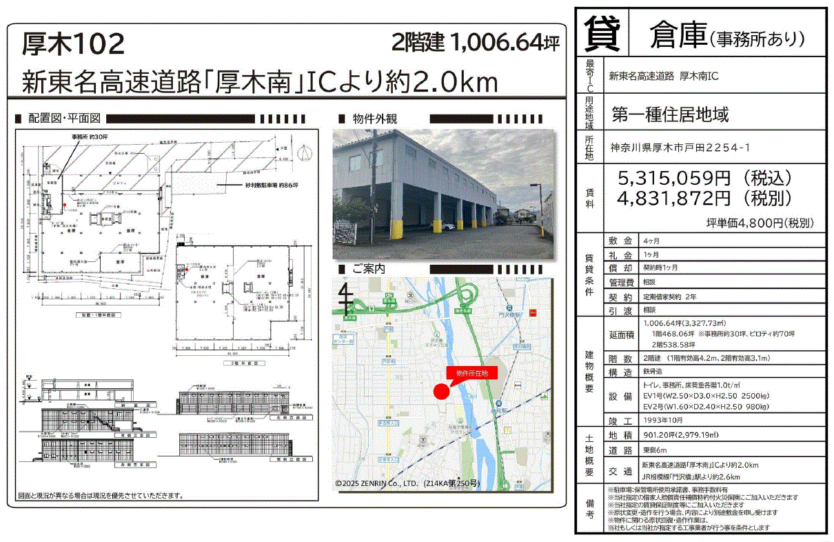 | 倉庫 | 2階建貸倉庫 1階天井高4.2m 新東名厚木南IC2km EV2基有り 事務所有り |