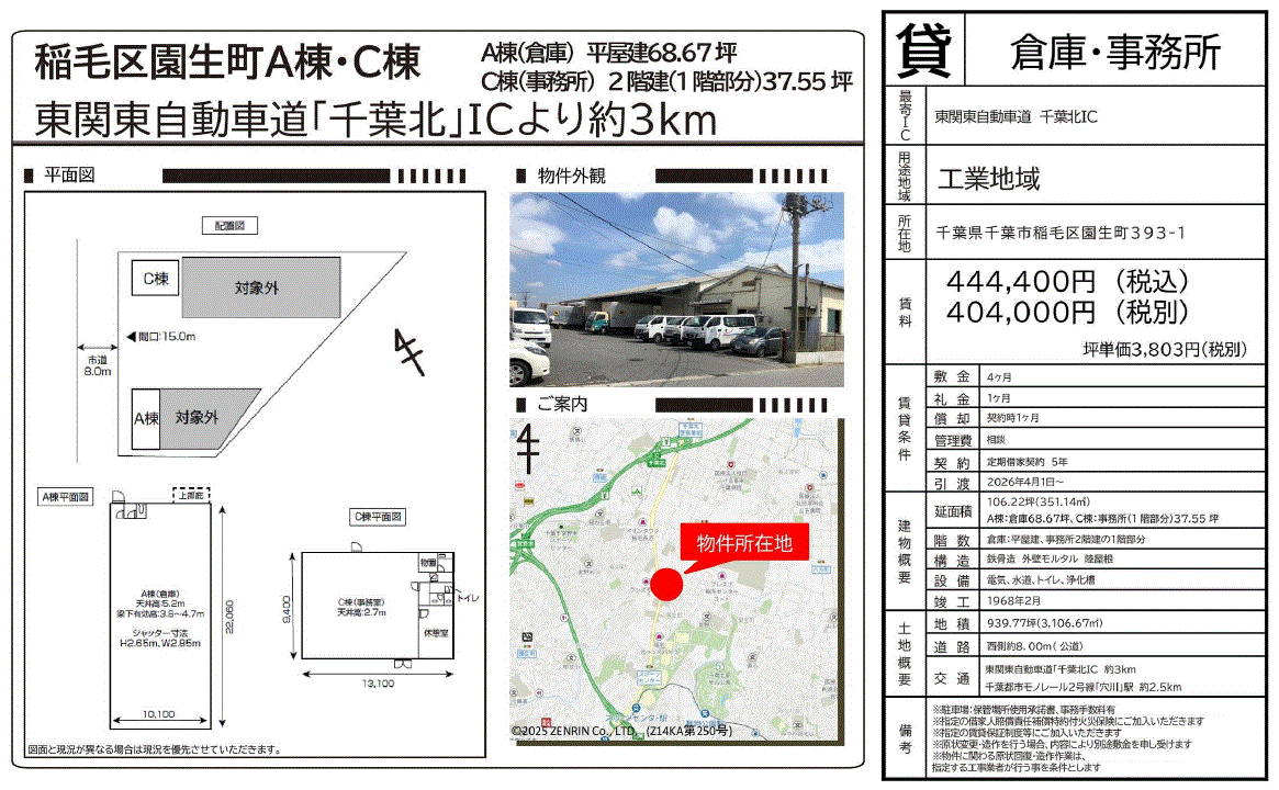 | その他 | *敷地共用 *A棟倉庫68坪、C棟事務所37坪、一括貸 *天井高:A棟5.2m、C棟2.7m *梁下:A棟3.8m~4.7m *中途解約時、解約違約金あり *駐車場:保管場所使用承諾書(事務手数料有) |