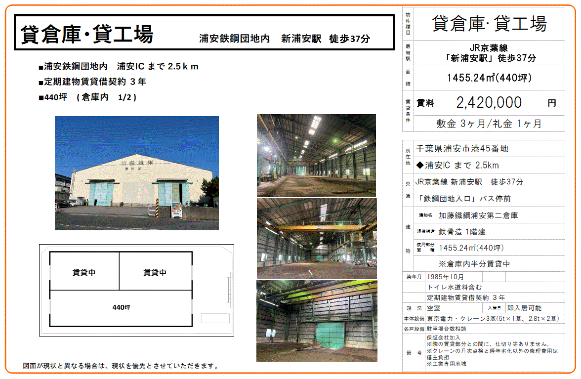| 倉庫・工場 | 平家建間仕切り貸し クレーン(5t1基、2.8t2基) |