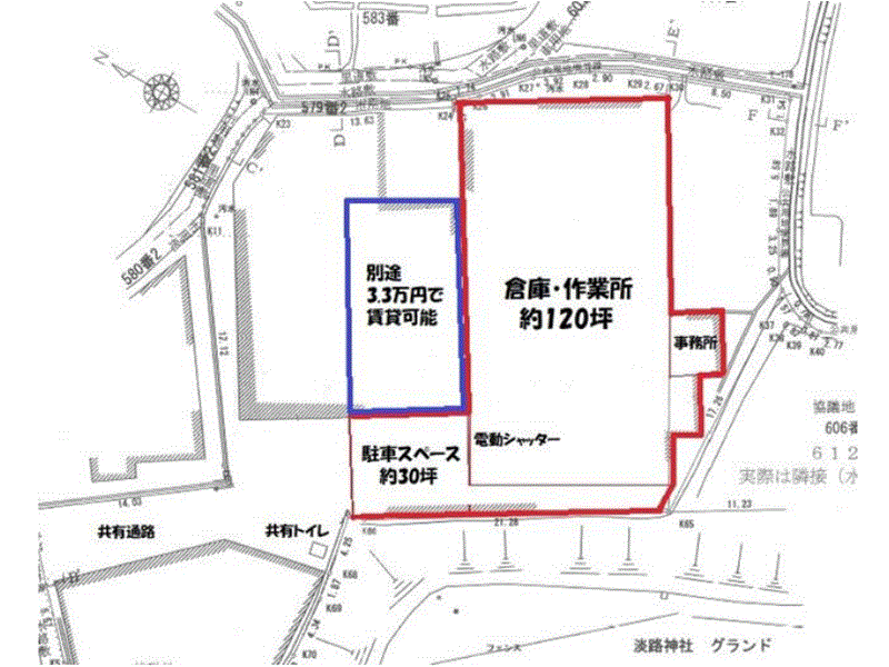 | 設備関連 | 動力電源 共有トイレ 電動シャッター 事務所有 | |