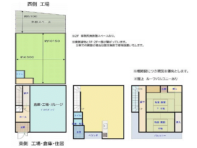 | その他 | *一棟貸し(東側は3階建住居付き工場。西側は工場+2階事務所スペースあり) *前面道路、大型車両の通行可。 *分割貸し相談可です。分割の場合は賃貸条件変更します。 *貸主はインボイス未取得です。 *借家人賠償保険加入要 | |