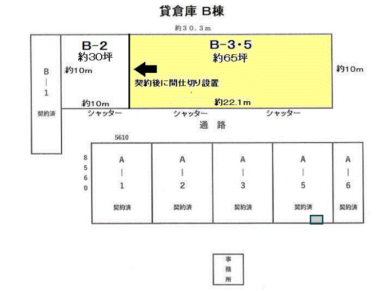 | その他 | 【B棟3・5号】 *敷金、礼金なし *現状渡し(契約後に間仕切り施工) *業種相談(スクラップ.リサイクル業不可) *産業廃棄物関連.危険物.火気類の使用不可 *高さ2.9m以上の車両の進入不可 *指定の保証会社及び火災保険への加入必須 *借家人賠償付火災保険 20,000円 保険期間2年 *1年未満での解約は違約金税込賃料2ヶ月 *倉庫土間アスファルト舗装新設 *軽作業可 *B棟一括貸しも可 *土地面積は航空写真より計測した面積です。 | |