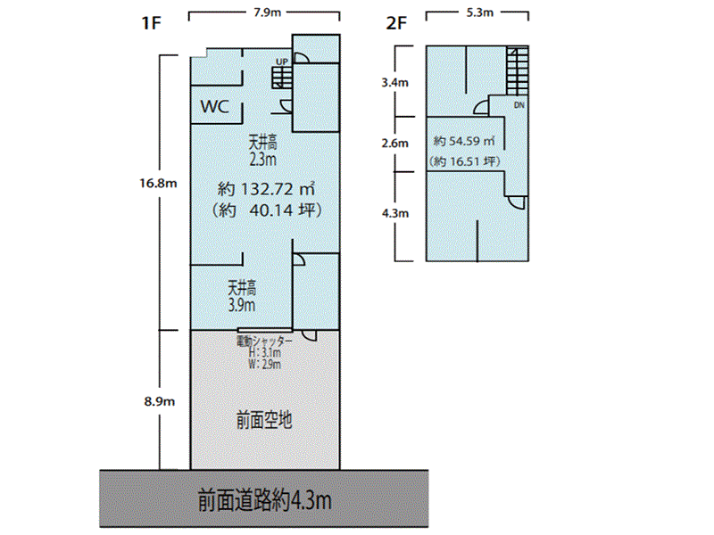 | 各階面積 | 1F:132.72m²/40.14坪 2F:54.59m²/16.51坪 | |