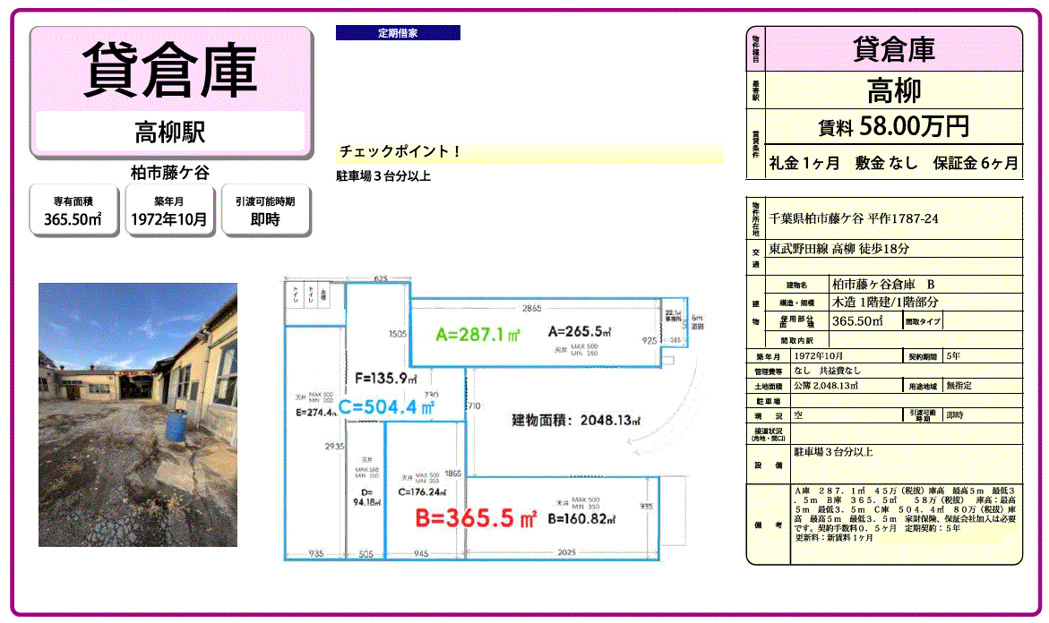 | その他 | *5年定期建物賃貸借契約 *再契約料:新賃料の1ヶ月分 *天井高3.5m~5m *保証会社加入要 *土地共用 |