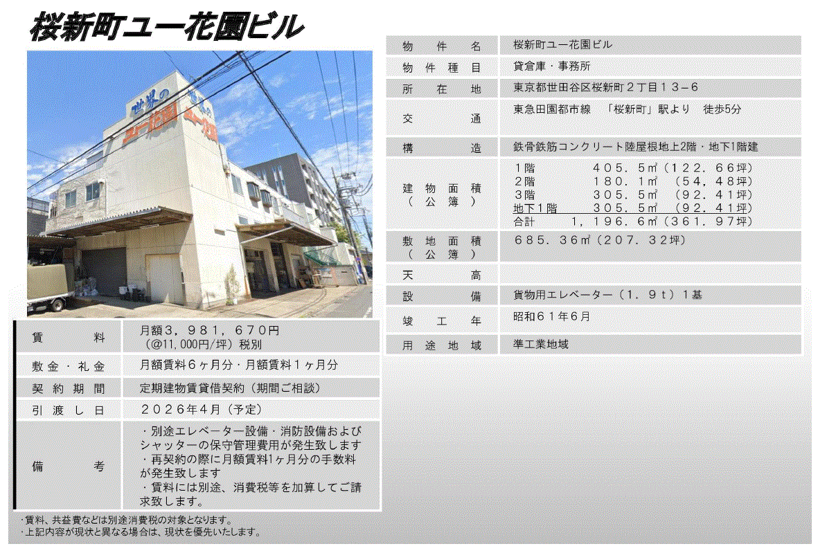 | 倉庫 | RC地下1階、地上3階建 貸倉庫、事務所 駅近徒歩5分 貨物用EV(1.9t) 準工業地域 |