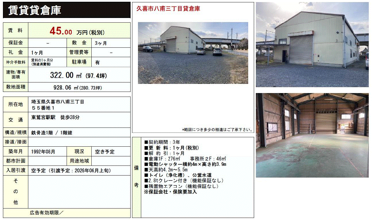 | 設備関連 | 電気引き込み有 電動シャッター 上水道 浄化槽 トイレ 2.8tクレーン(残置物) エアコン(残置物) |