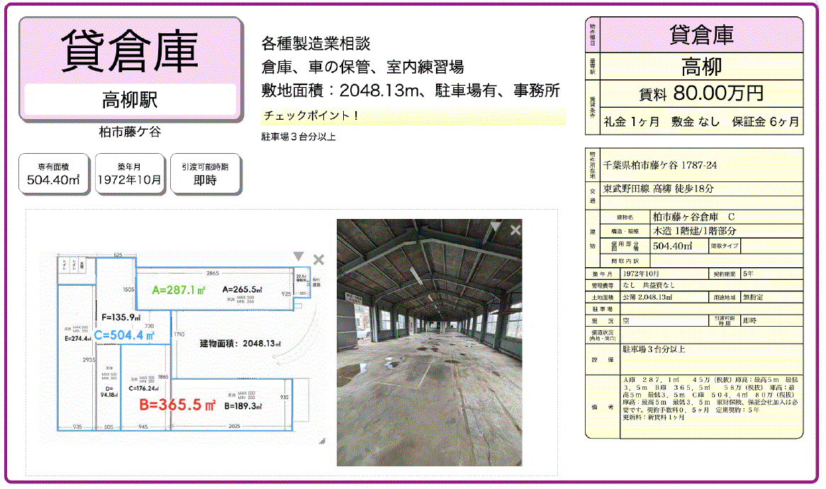 | その他 | *5年定期建物賃貸借契約 *再契約料:新賃料の1ヶ月分 *天井高3.5m~5m *保証会社加入要 *保険加入要 *土地共用 |
